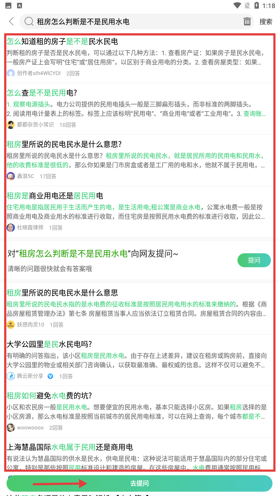 4、点击搜索后,就能看到各类用户分享的相关回答啦,要是没找到满意的,还能点击底部【去提问】,让网友帮忙解答哦。