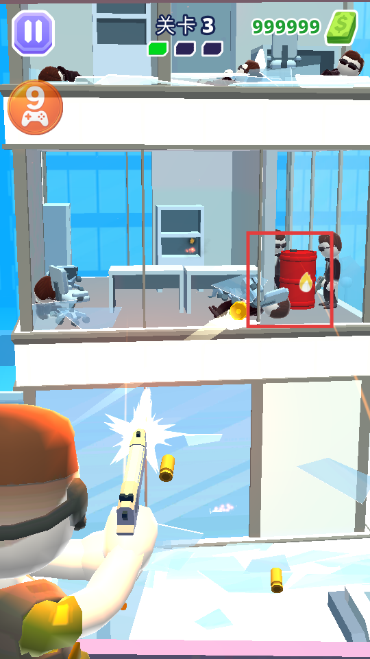 1、在关卡中,瞄准建筑内的油桶或敌人,进行射击,利用场景元素打击目标。