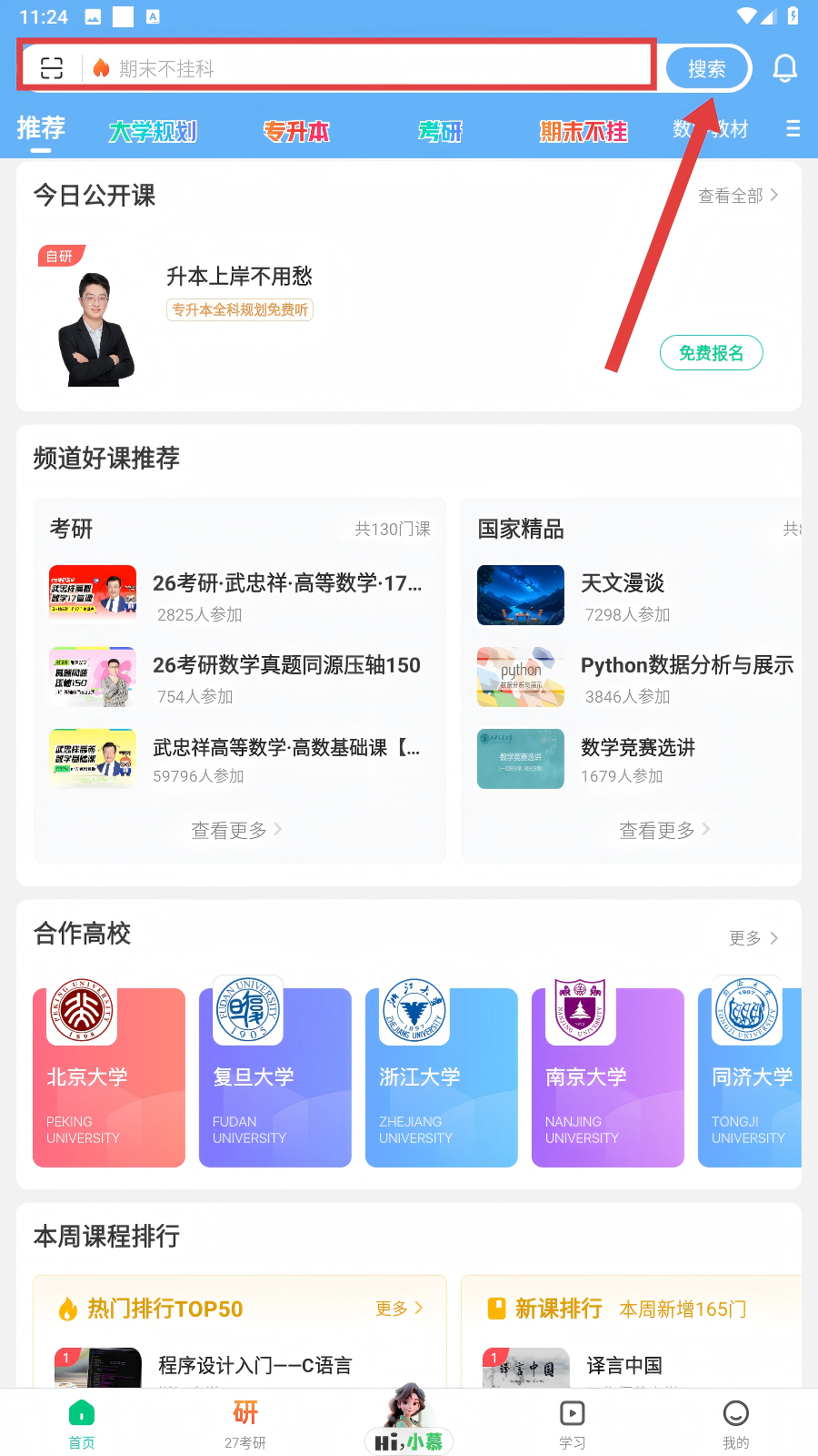 1、打开中国大学MOOC,点击顶部搜索栏,准备查找相关课程啦。