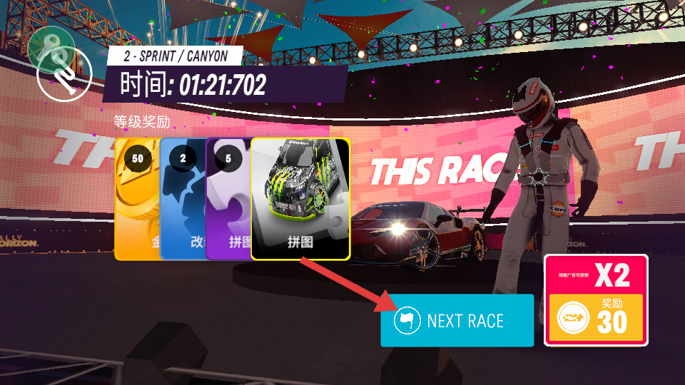 4、比赛结束后,会获得奖励,点击蓝色的【NEXT-RACE】按钮,可进入下一场比赛。