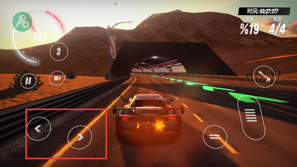 3、使用左侧的方向按钮调整赛车方向,确保顺利进入隧道,继续推进比赛。