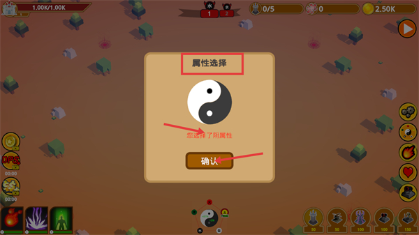 1、进入【属性选择】界面,选择“阴属性”后点击“确认”按钮,完成初始属性的选定,该选择会影响后续战斗的属性倾向。