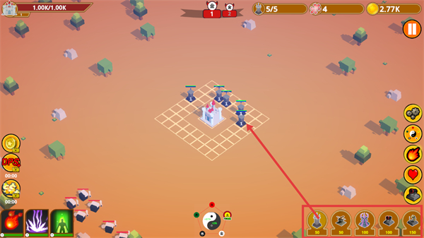 3、敌方单位来袭时,已部署的防御塔会自动攻击敌人,需留意左上角城堡的血量(初始1.00K/1.00K),及时补充防御建筑巩固防线。