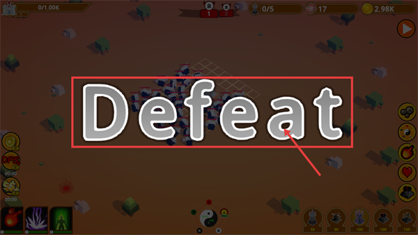 4、若防御不足导致城堡被攻破,界面会显示“Defeat”,此时需调整防御塔的部署布局、提升建筑等级,重新挑战关卡以强化防御效率。
