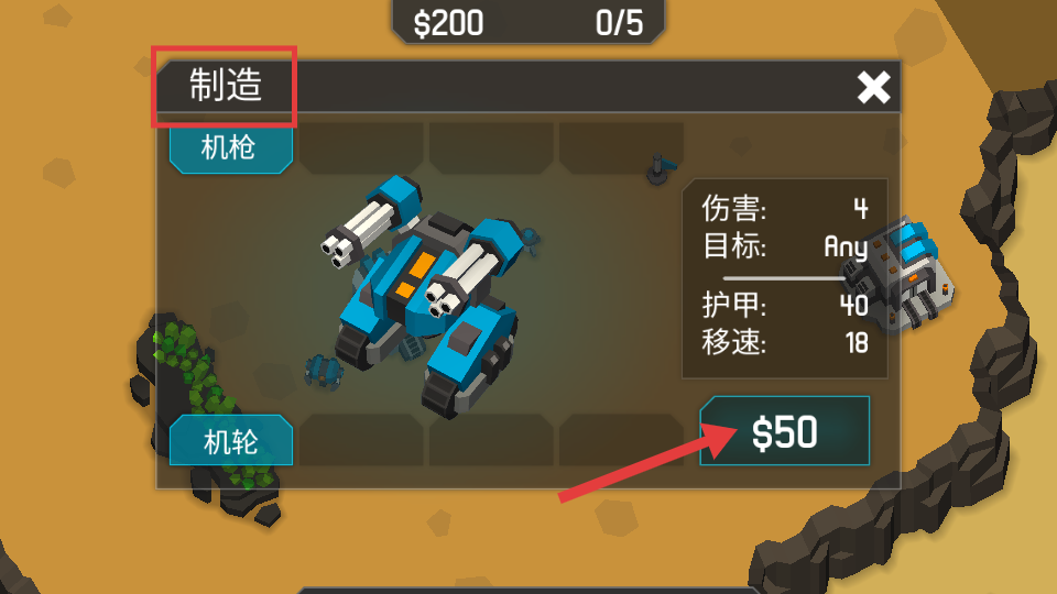 4、在制造界面,花费【$50】制造机枪单位,获取具备伤害、护甲等属性的战力。