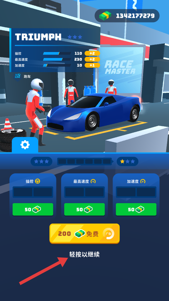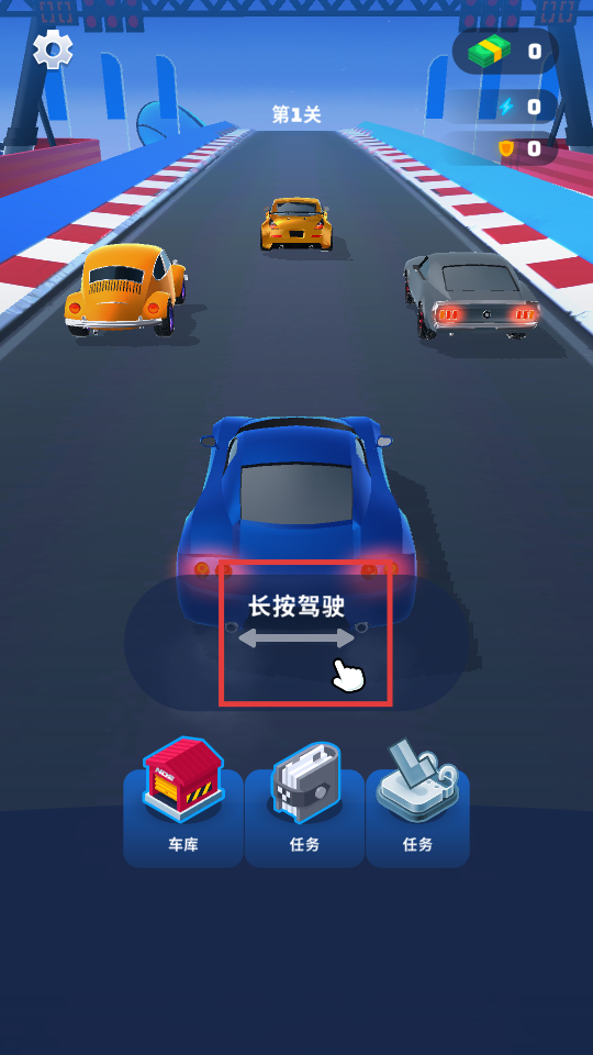 1、在【第1关】,长按屏幕控制车辆行驶,参与赛车比赛。