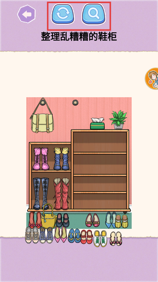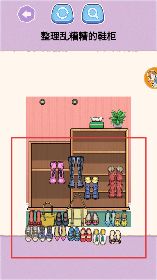 3、进入【整理乱糟糟的鞋柜】关卡,开始对鞋柜里的鞋子、包包等物品进行整理。