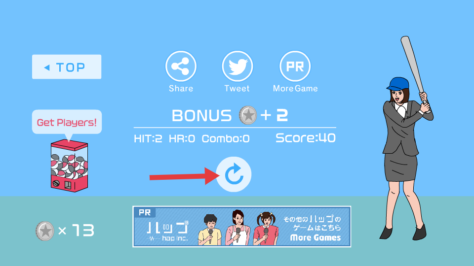 3、瞄准飞来的棒球,精准挥棒,增加【HIT】的次数,提升得分。