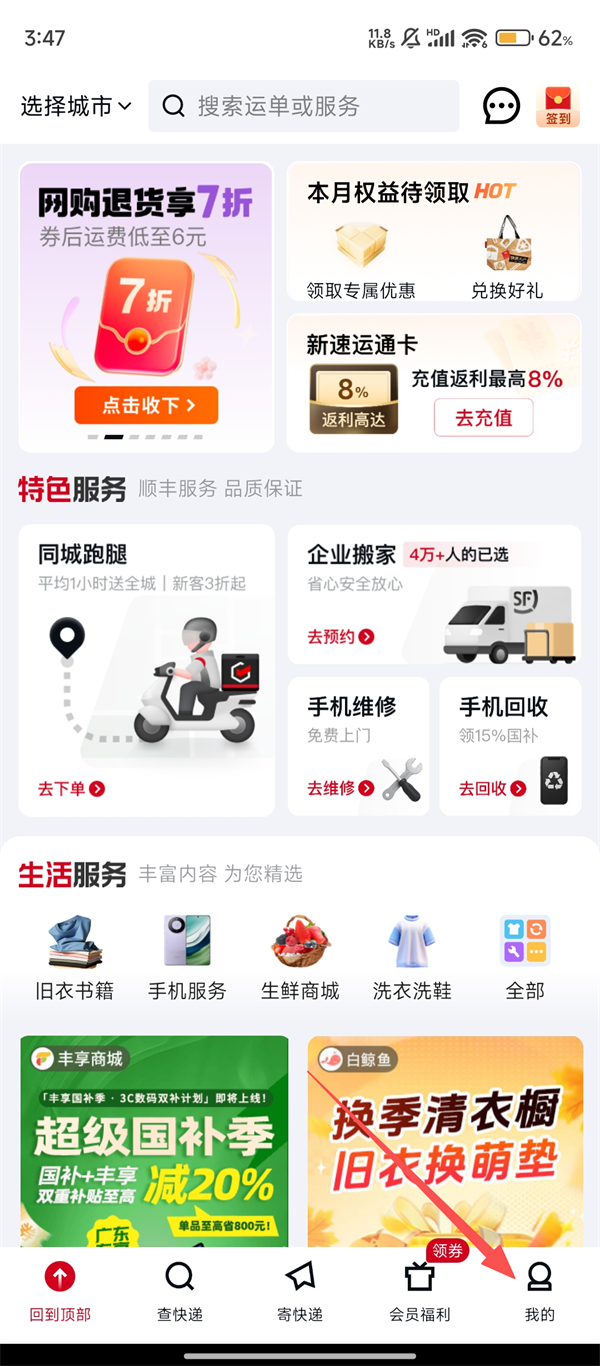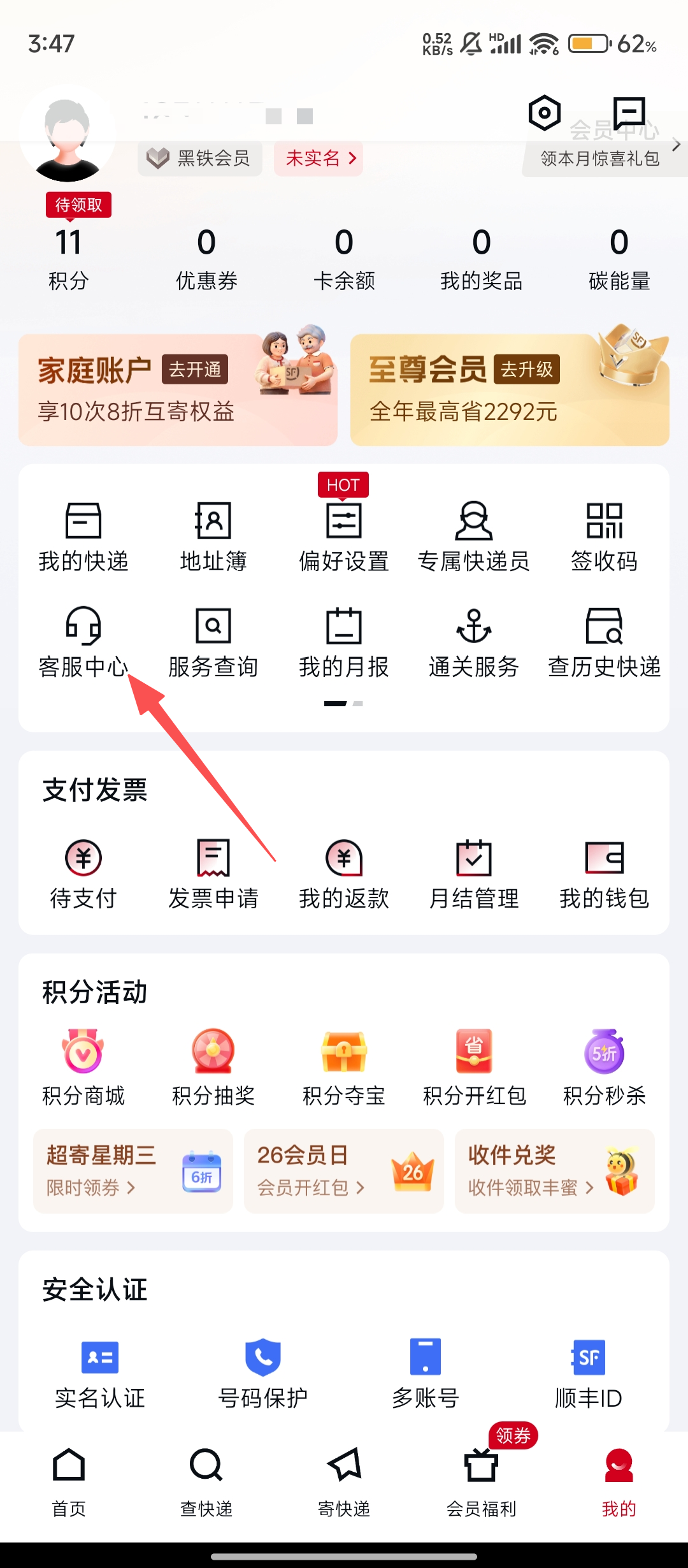 * 我的顺丰:查看积分、优惠