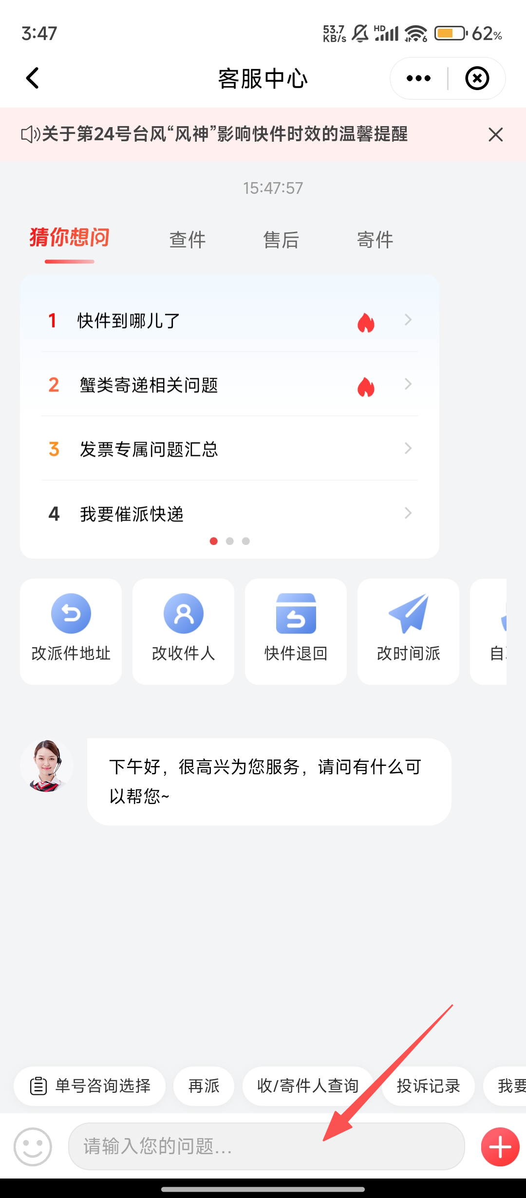 4、在【在线客服】的输入框中输入问题,即可转接人工客服,解决你的快递疑问啦。
