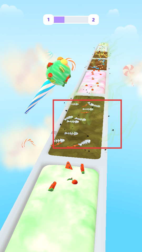 3、避开带有鱼骨的障碍物区域,继续在糖果食材区域滚动,保持收集节奏。