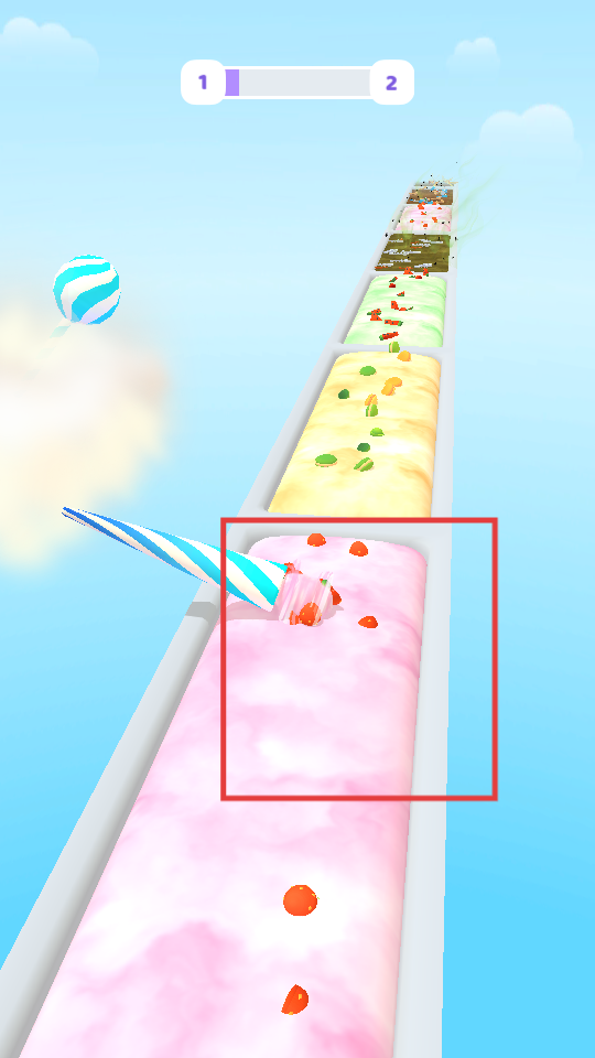 2、操控棉花糖棒在粉色食材赛道滚动,收集糖果配料,增加食材量。