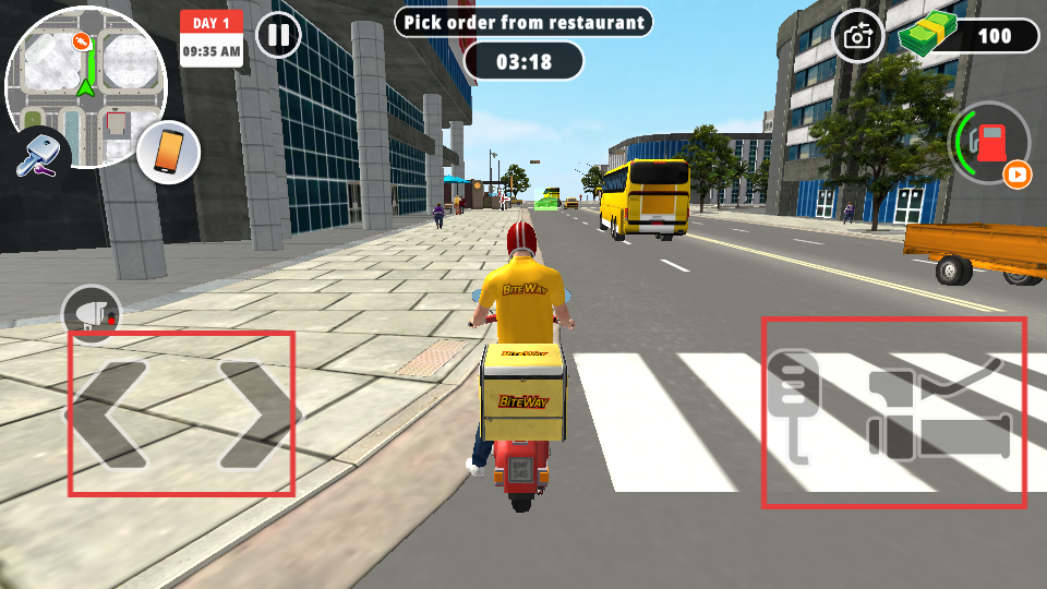 4、驾驶车辆时,用左侧方向按钮控制方向,右侧按钮操控车辆,前往餐厅取订单。