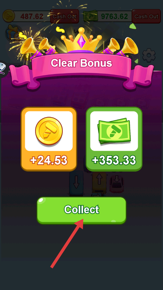 4、关卡完成后,点击绿色【Collect】按钮,收集金币和现金奖励。