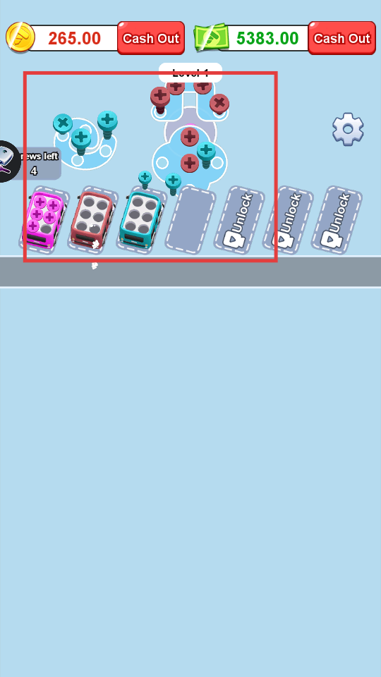 3、将不同颜色的螺丝匹配到对应位置,利用车辆运输螺丝,推进关卡进度。