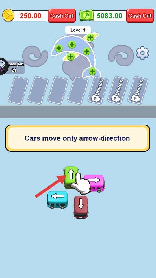 2、根据提示【Cars-move-only-arrow-direction】,操作绿色带向上箭头的车辆移动。