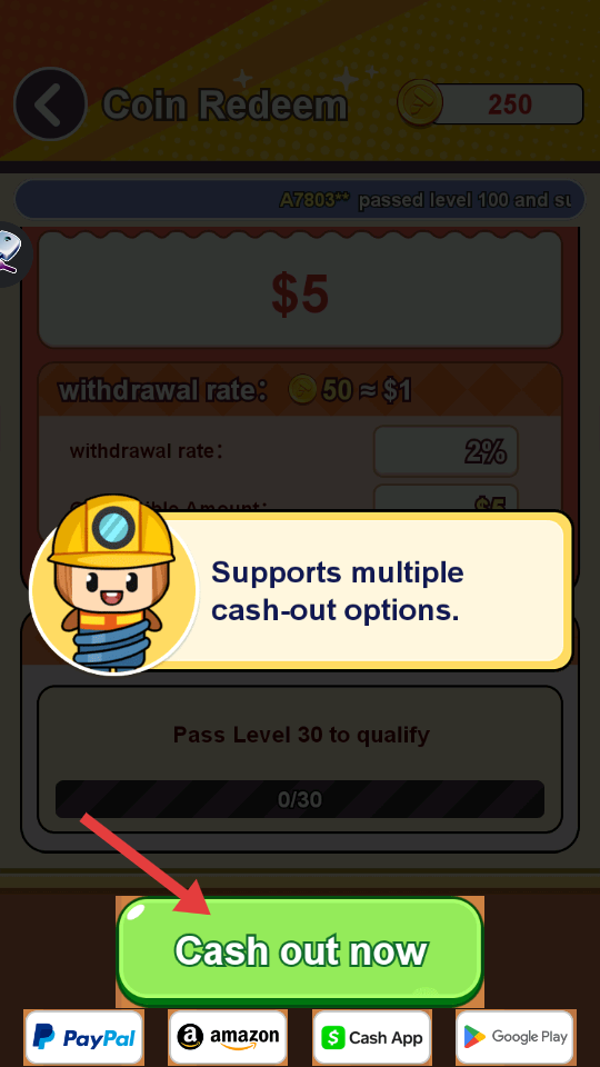 1、点击【Cash-out-now】,了解支持多种提现选项,需通过30关来获取提现资格。
