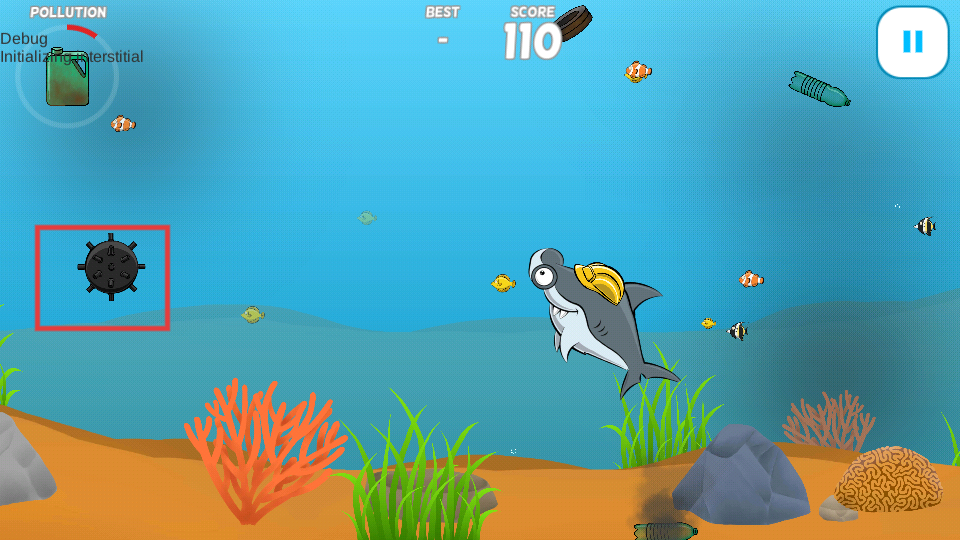 2、通过虚拟滑杆操控鲨鱼,收集海洋中的垃圾,积累分数。
