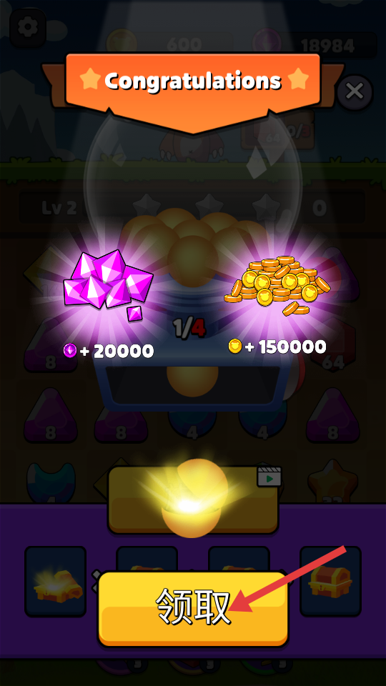 4、关卡完成后,点击【领取】按钮,获取奖励,进入下一关。
