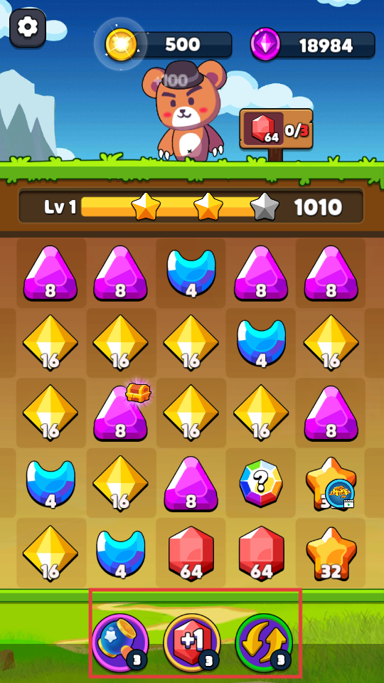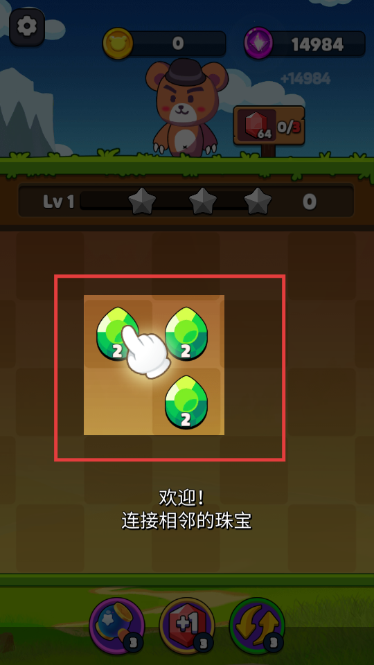 1、根据提示,连接相邻的珠宝,开启游戏关卡。