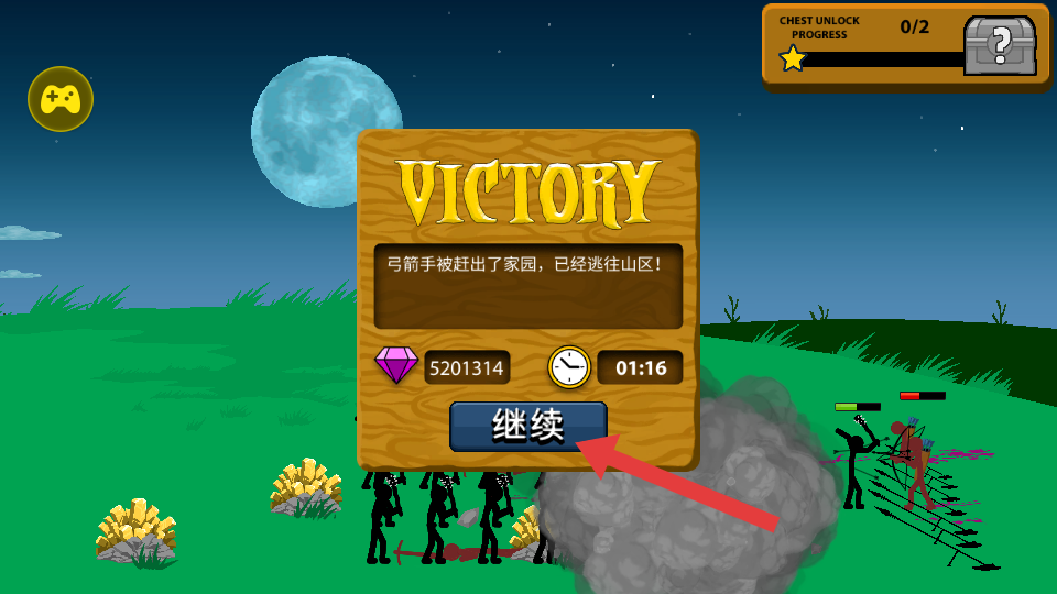 4、战斗胜利后,点击【继续】按钮,可继续挑战下一场战斗,获取大量奖励。