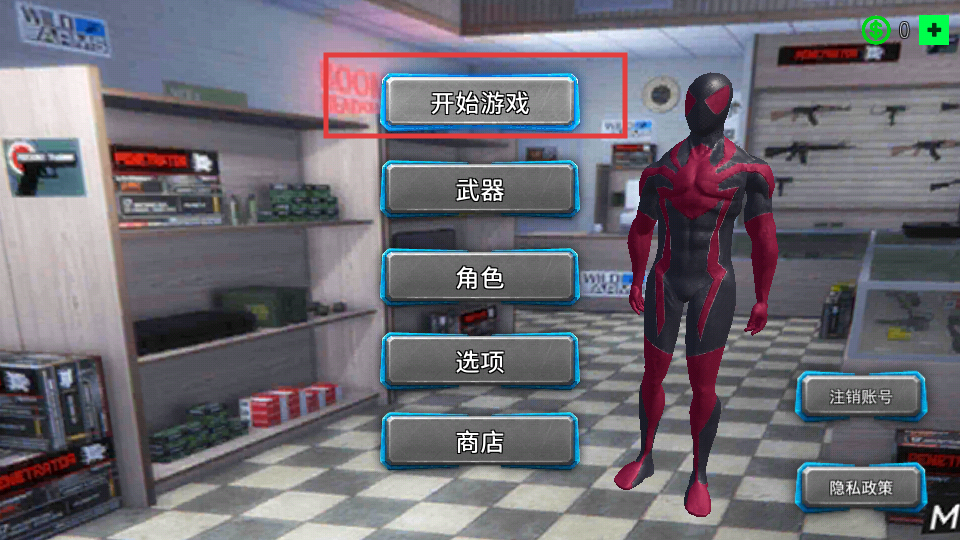 1、进入游戏主界面后,点击【开始游戏】按钮即可开启坡道车极限挑战之旅,界面中还有【武器】【角色】【选项】【商店】等功能按钮可后续探索。