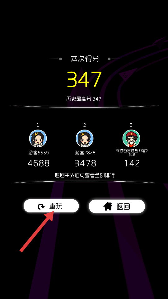 4、游戏结束后,可点击【重玩】按钮再次挑战,也能查看本次得分与排行榜情况。
