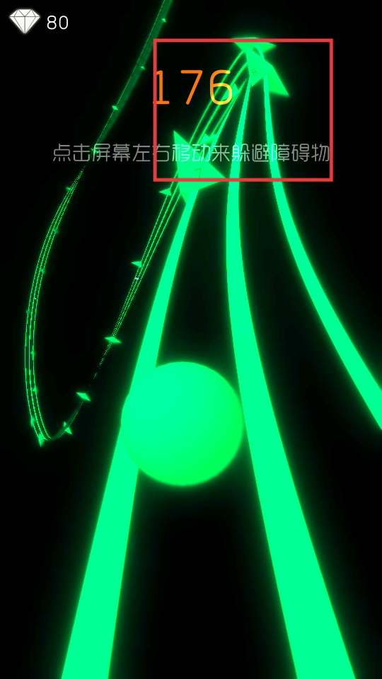 2、点击屏幕左右移动球体,躲避障碍物,同时留意上方的分数变化。