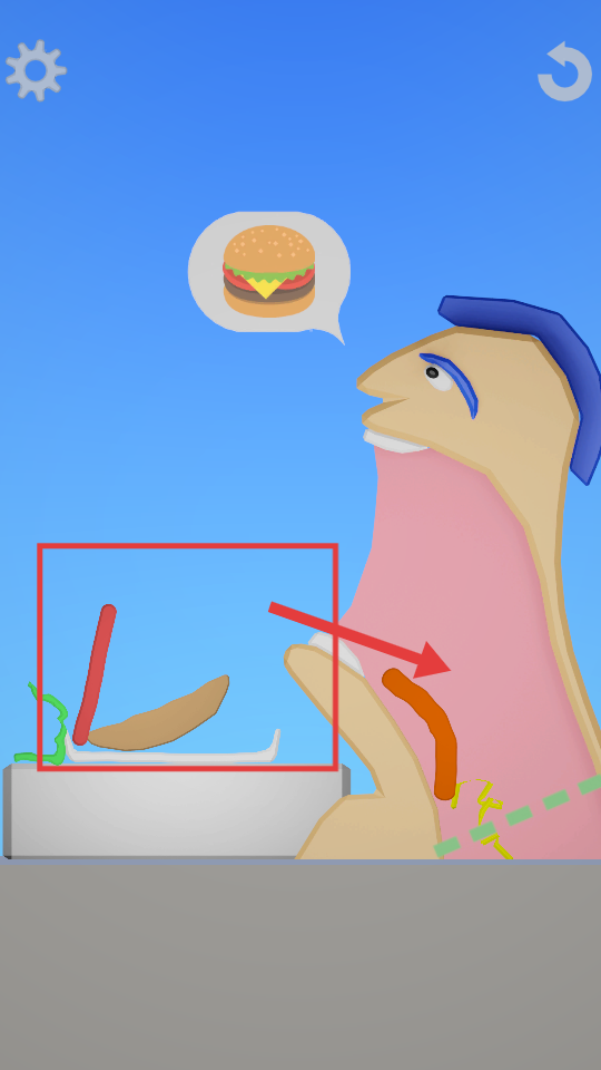 3、根据人物想要汉堡的需求,将对应的食物部件移动到人物的口中。