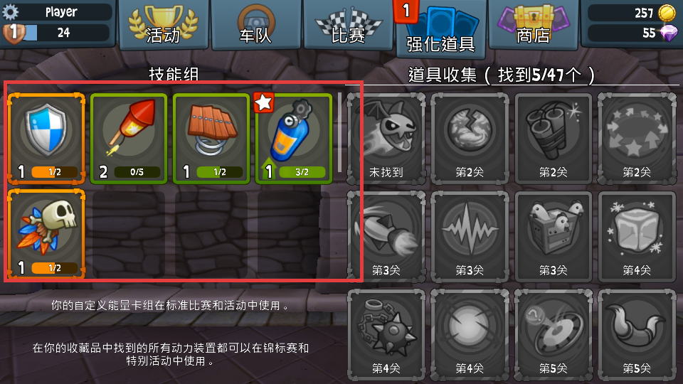 4、在道具界面,查看技能组中的各类道具,了解其数量,以便比赛中合理选用。