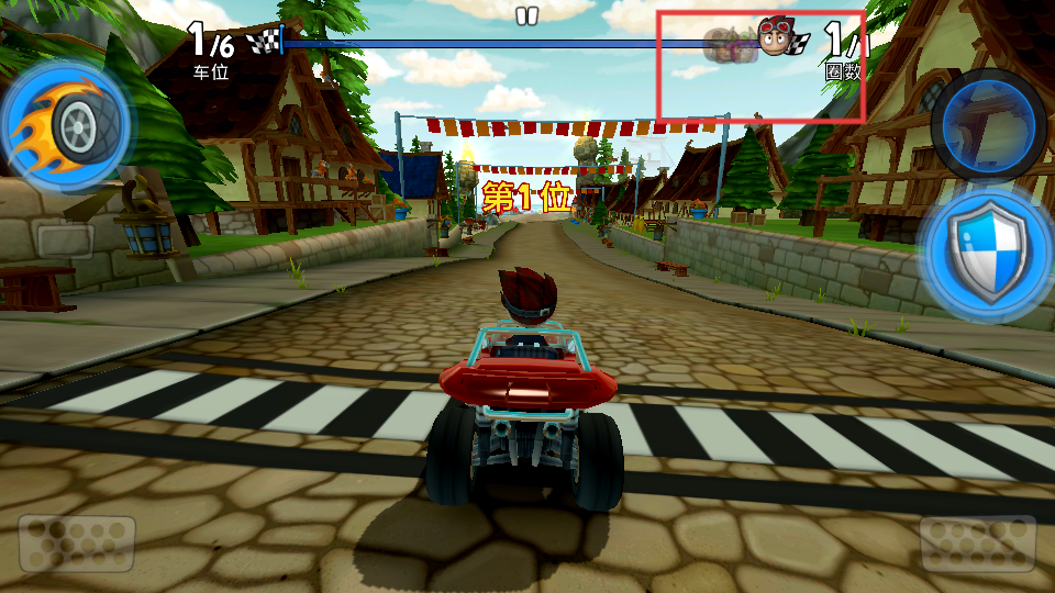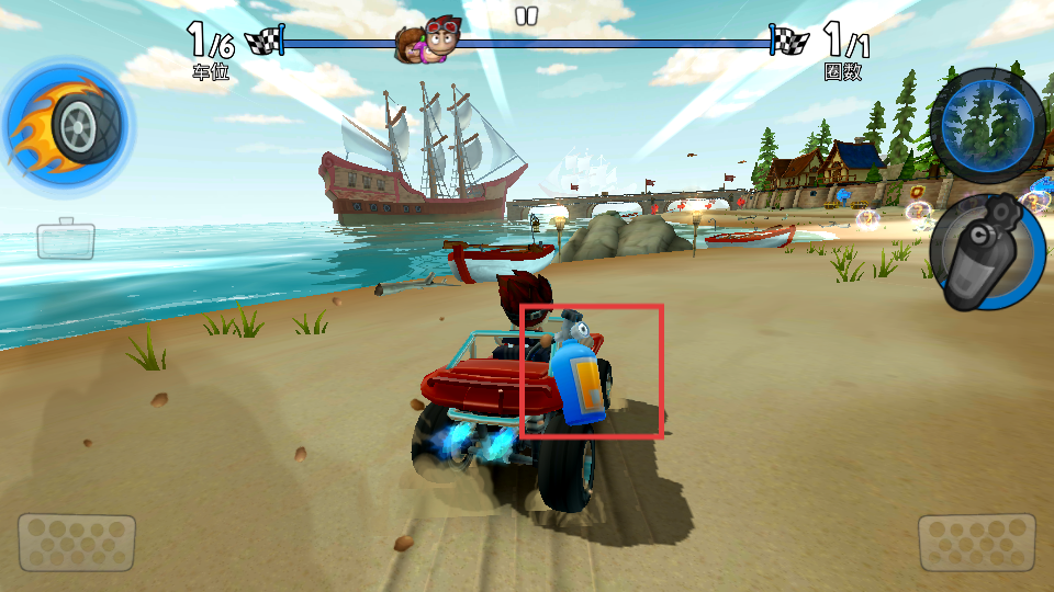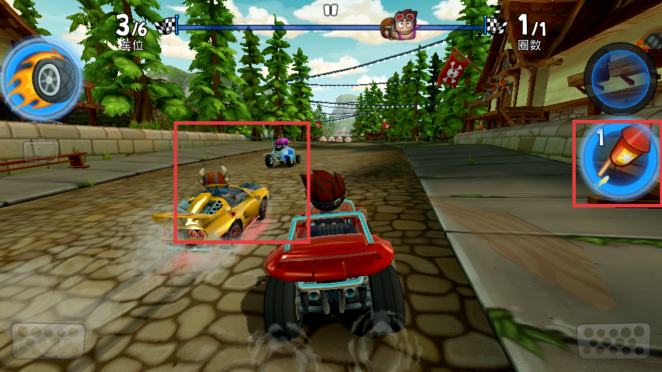 2、遇到前方的黄色赛车等对手时,使用右侧道具,尝试超越对手。