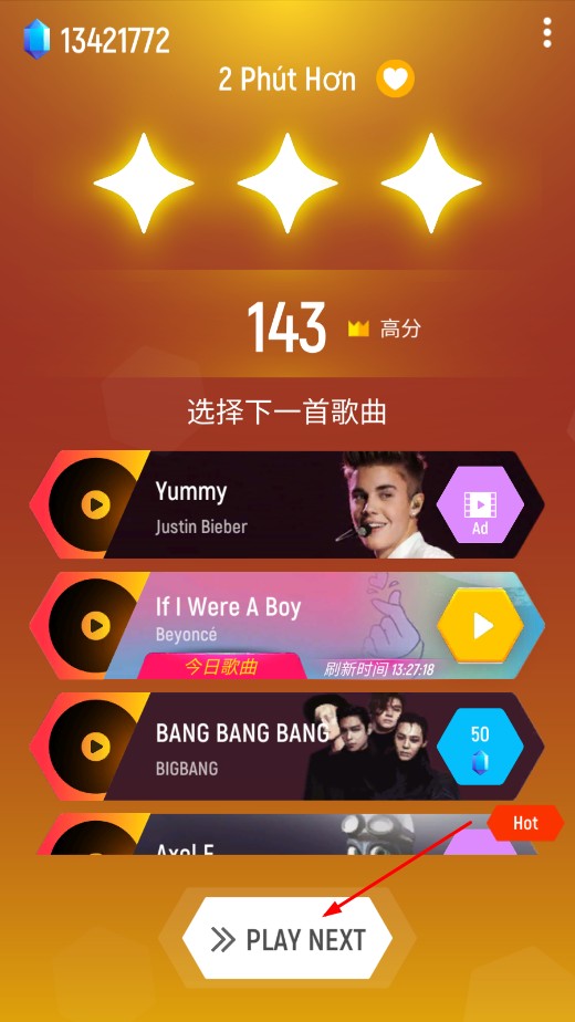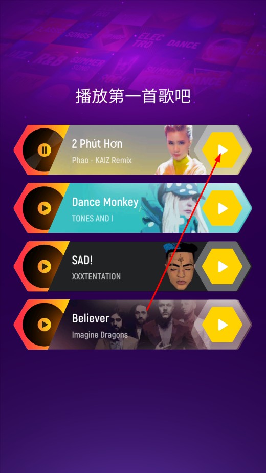 2、进入歌曲列表,选第一首歌(如《2-Phút-Hon》),点击播放按钮开始游戏。