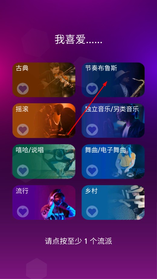 1、在音乐流派选择页,点选至少1个喜爱的流派(如节奏布鲁斯),完成偏好设置。