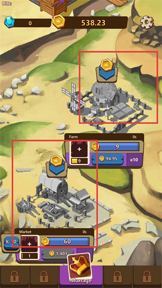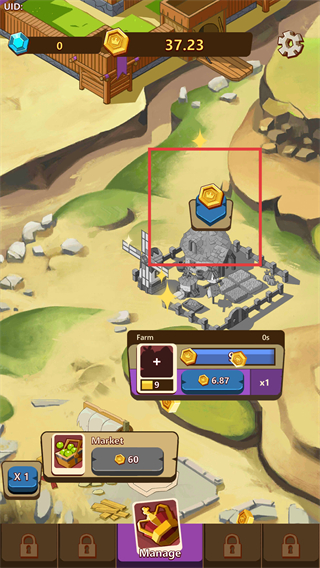 3、【Market】进入自动产出状态,每秒积累资源,顶部【金币】实时增加,持续提升资源储备量。